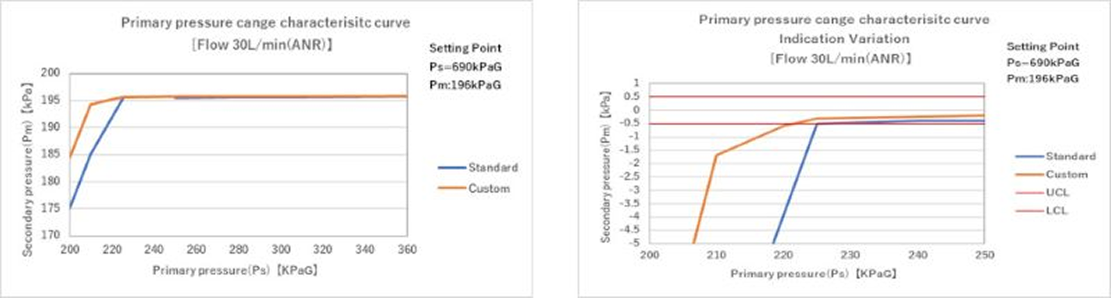 - 流量特性 :Max.100L/min(ANR)で圧力変動を±0.5KPaG以内にしたい